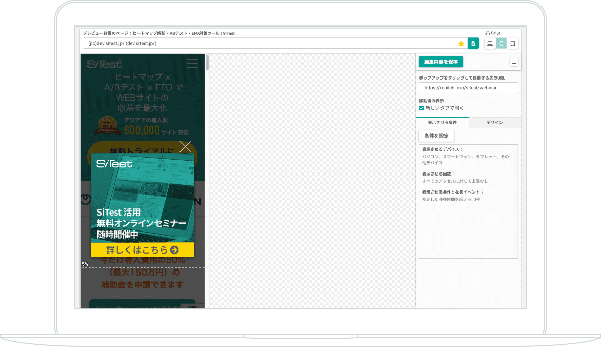 さらに、スマホとパソコンで違う内容のポップアップを出すこともできるので、どの端末で見ても快適にサイトを利用してもらえます。