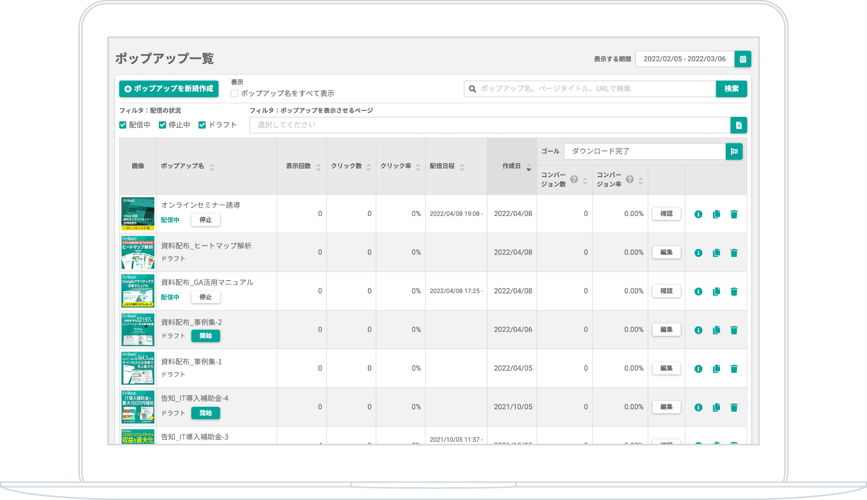 配信したポップアップに対する、サイト訪問者の「クリック」の反応はもちろん、設定したゴールに対する「ポップアップを経由したコンバージョン」を一覧画面で確認できます。