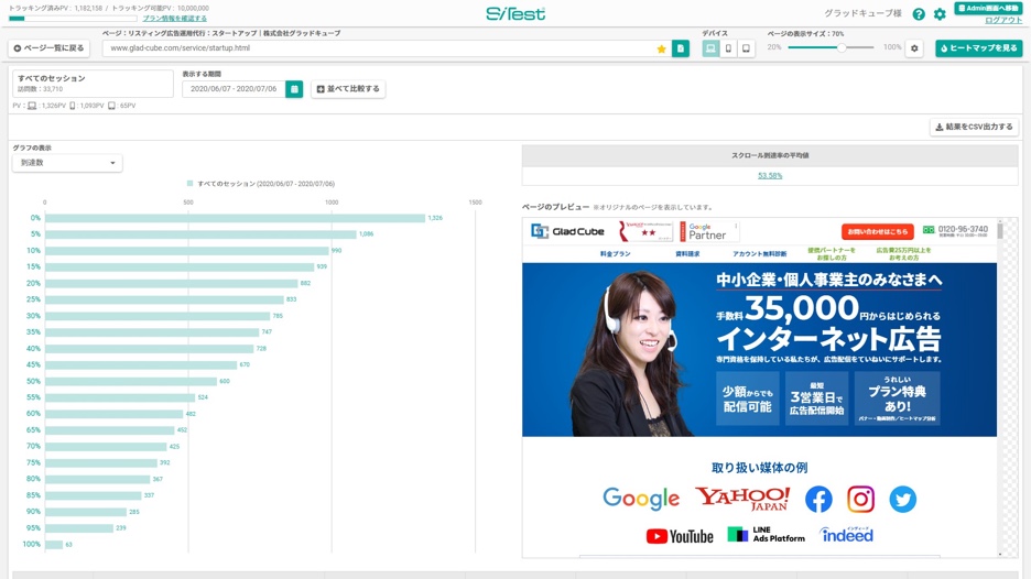スクロール地点ごとの「到達数・到達率・離脱数・離脱率・平均滞在時間」を数値とグラフによって視覚化します。